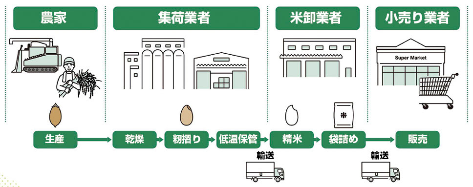 流通においては、JAグループの場合、各JAや全国農業協同組合連合会(JA全農)の販売事業を通じて小売店などに届けています。また、農家が直接消費者に販売するケースもあります。米卸売業者は玄米を受け取り、精米工場で白米に加工した上で、小売店や中食・外食店などに販売します。JAグループは全国各地に精米工場を持っており、集荷から販売までをグループにおいて一元的に受け持つことが可能です。このようにして、消費者は安全で品質の確かな米を購入することができるのです。