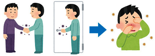 咳・くしゃみなどが飛び散り、目や鼻などの粘膜に付着。