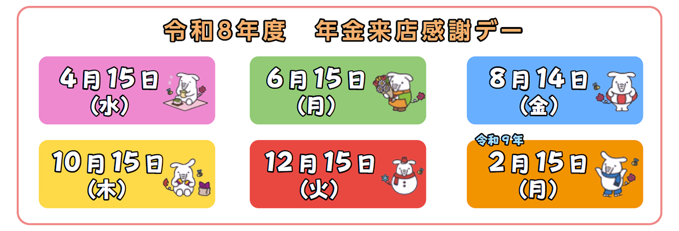 JAみな穂では日頃の感謝の気持ちを込め、年金来店感謝デーを開催しております。当JAで年金をお受取りのお客さまで、年金振込日に窓口へご来店いただいた方へ、プレゼントをご用意しました。