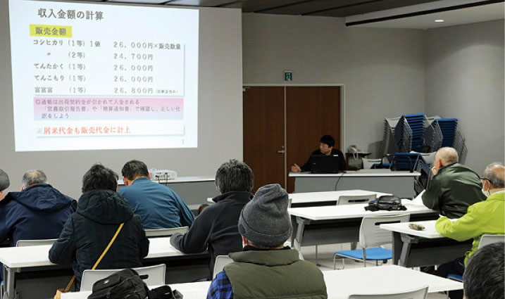 JAは2月9日、「令和7年分農業所得決算講習会」をJA本店で開き、JA管内の農業者ら約20人が参加しました。講習会では、営農企画課の米田吉仁営農指導員が講師を務め、申告作業の手順や注意点などについて説明しました。その後、企画管理課の岩田和己課長が「消費税」に関することや、「営農取引報告書の再交付」について話しました。