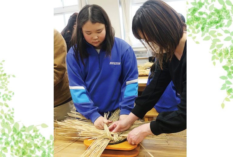 特産「入善ジャンボ西瓜」の梱包材として利用する稲ワラの編み物「さん俵」作りを、入善町内4つの小学校の5年生が体験しました。2月6日は、入善小学校の児童が授業参観の一環で「さん俵」作りに挑戦しました。入善ジャンボ西瓜生産組合の組合員から作り方を教わりながら親子で「さん俵」を編み上げました。体験した佐田琉衣さんは「難しかったけど教えてもらいながら上手に編むことができた。」と話しました。