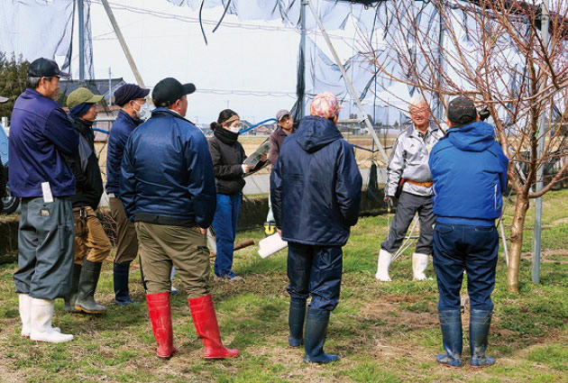 JAみな穂もも振興会は2月24日、桃の剪定講習会を入善町の農事組合法人せせらぎ営農組合の園地で開き、会員ら14人が参加しました。新川農林振興センターの大城克明園芸振興班長は園地の果樹を実際に剪定しながら①側枝は骨格枝に対し、桃の葉型に配置すること②樹形を乱すような太い側枝は置かないこと③若木では枝同士が接触しない程度に側枝の間隔をあけることなど、剪定のポイントを呼び掛けました。